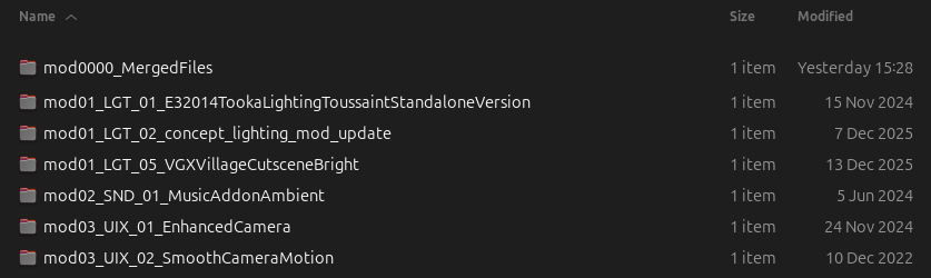 Note that this list is in order, in that it also represents the order in which your mods should load in the mods folder. The mod at the top of the list should have mod01 prepended to the file name, and the mod at the very end should have mod99 prepended or whatever name is most suitable.