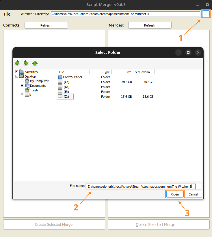 After launching Script Merger You will need to provide it with the game directory. However, the game directroy will not show inside Proton.