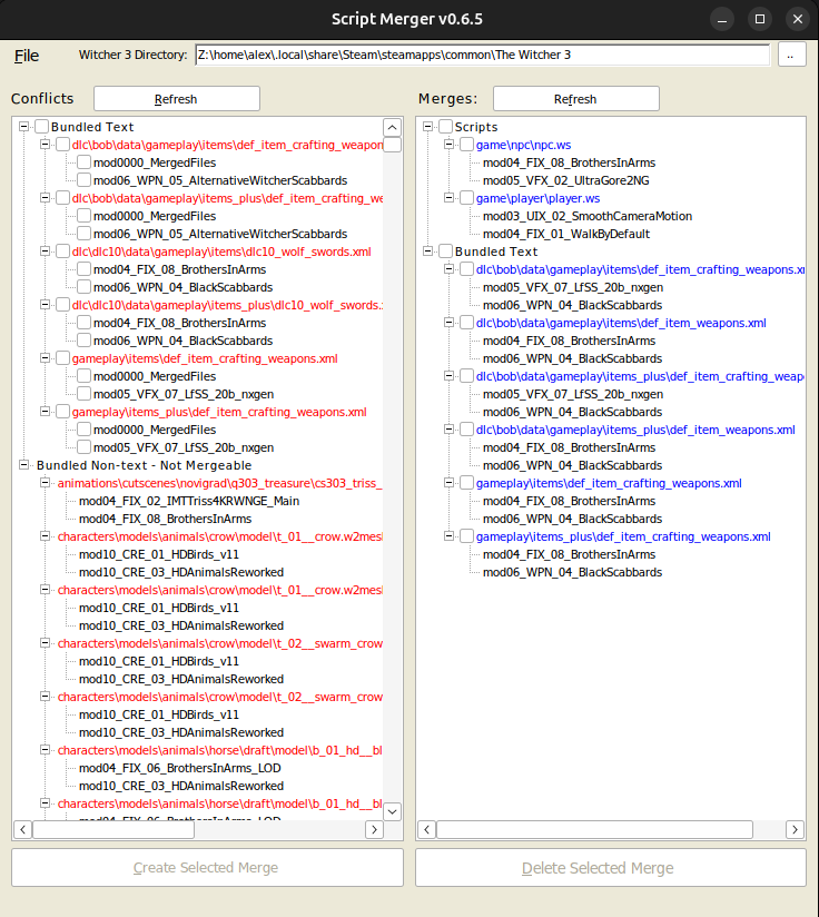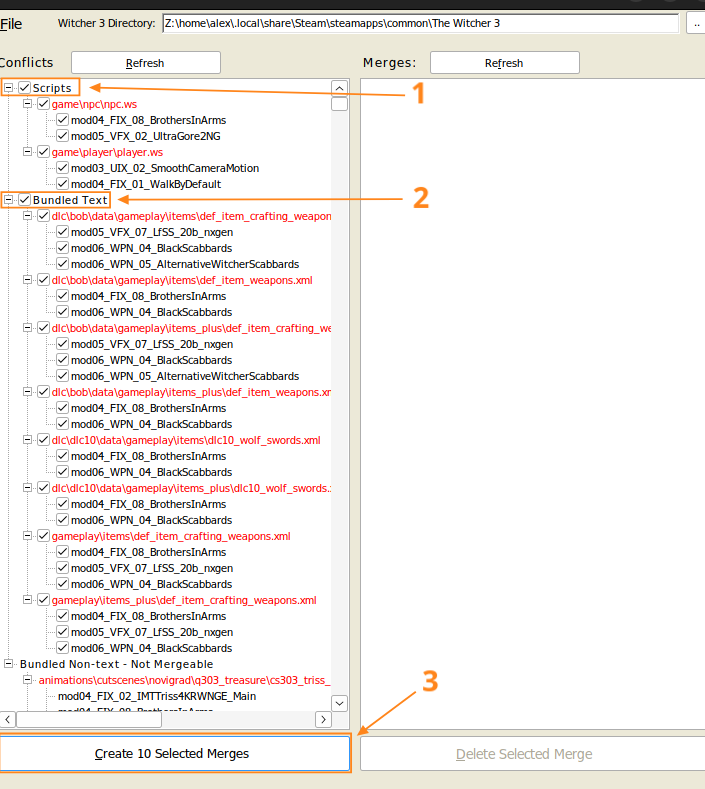 Once complete you should have a file called "mod0000_MergedFiles" at the top of your mods folder and your Script Merger should have the resolved conflicts listed on the right hand side in blue.